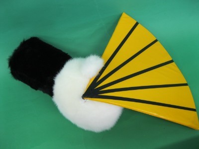 左手に応援用の扇子、右手に商売繁盛の笹を持っています。